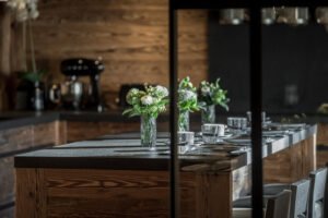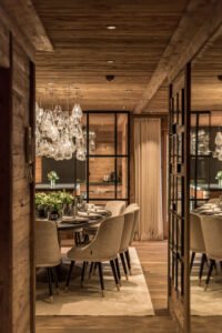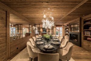 The open-plan living and dining area is a showcase of Alpine elegance, featuring a grand fireplace, plush designer furnishings, and expansive windows that frame panoramic mountain views. The adjacent formal dining area seats up to 14 guests, while the fully equipped kitchen provides everything needed to create gourmet meals.