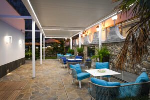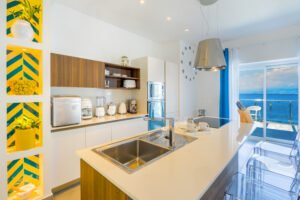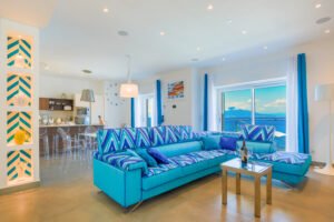 Villa’s living area is fully open concept with its glass doors that slide into the walls to access a wonderful view of the bay.Â